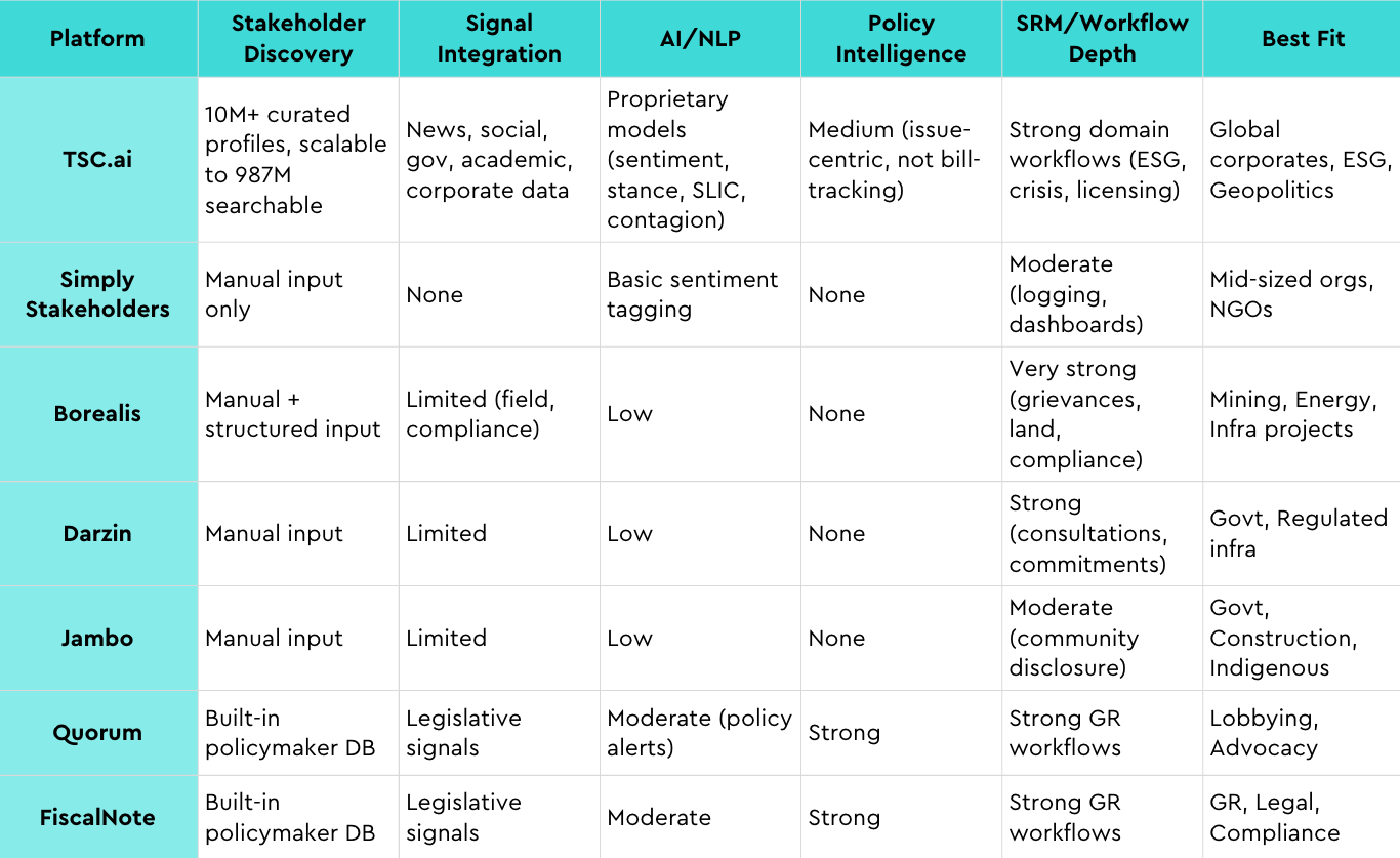 No single platform addresses all stakeholder management needs. The appropriate system depends on organisational context, risk exposure, and strategic objectives. For corporations facing multidimensional, fast-moving issues across geographies, TSC.ai stands out as the closest to a decision-support system.